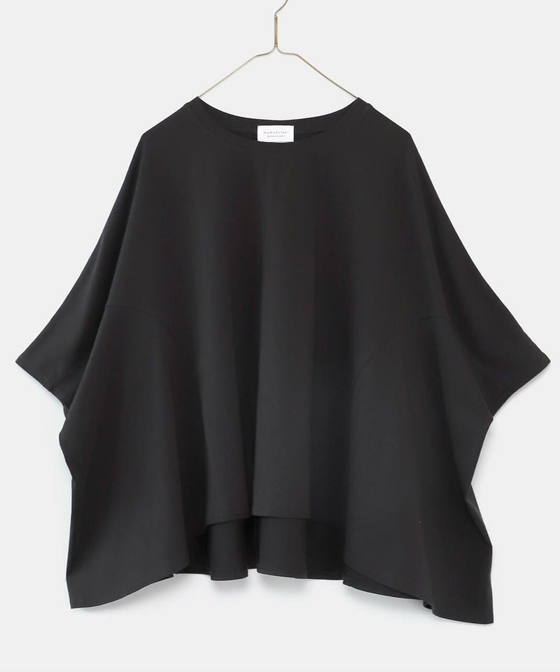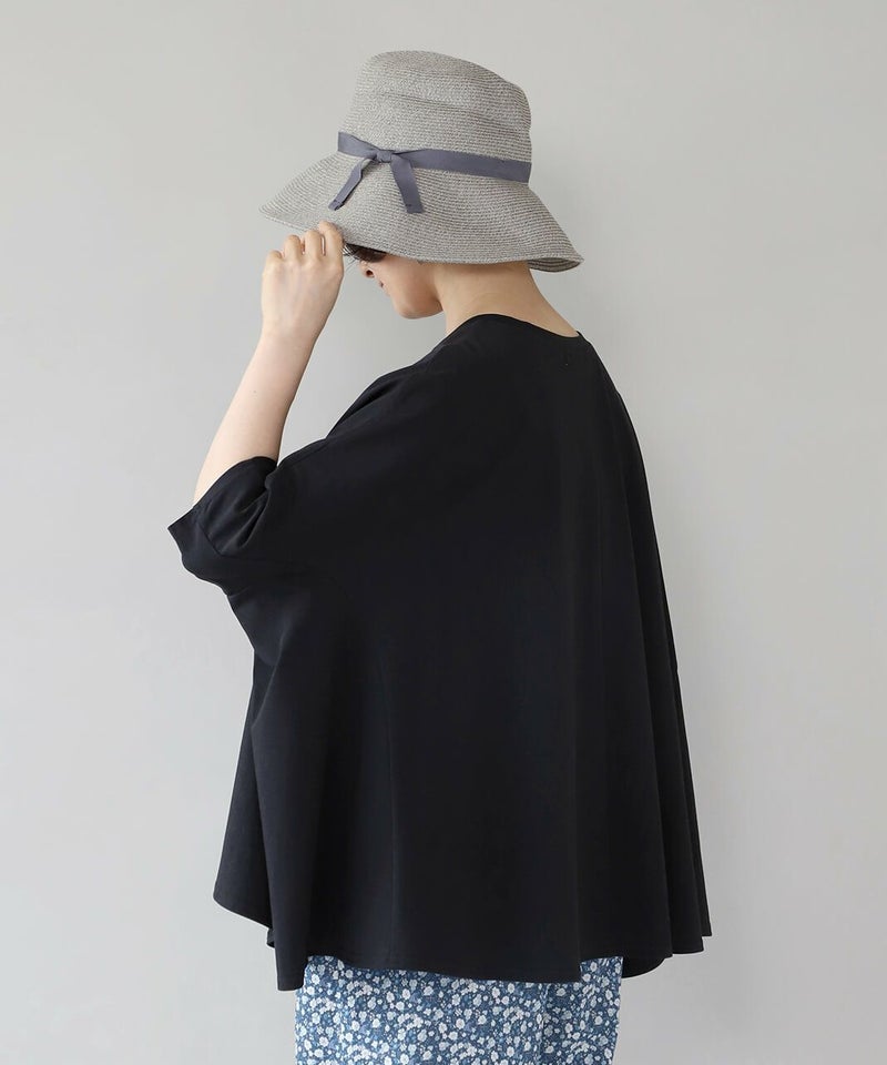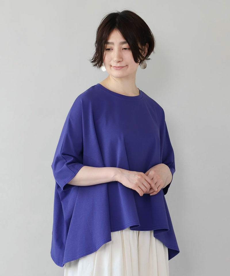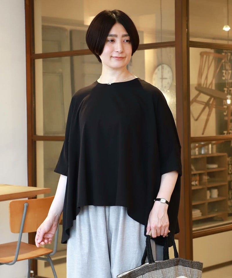 全体的にゆったりとしたサイズ感で、特に身頃・脇周りはノンストレス。すっきりとした半端袖は、年齢の出やすい肘が隠れる絶妙な丈感です。