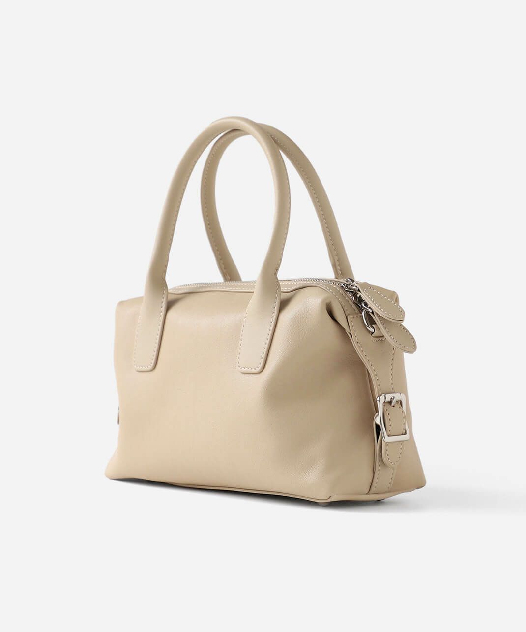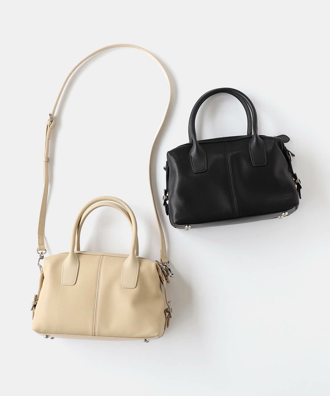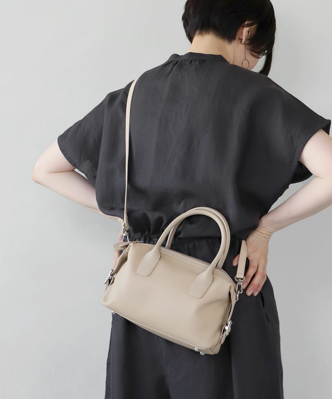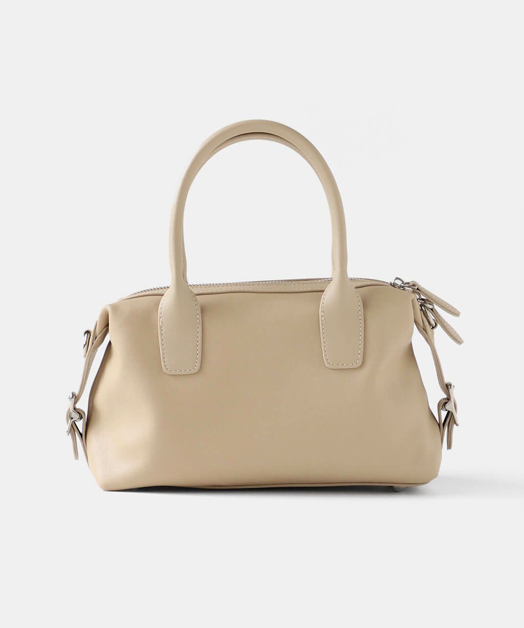 牛革のサイドにベルトのデザインがはいったハンドバッグ。 ショルダーストラップが付属している2WAY仕様です。 シボ感や光沢のないスムースな革の質感で、しっかりとした形は保ちながら適度に柔らかく扱いやすいバッグです。
