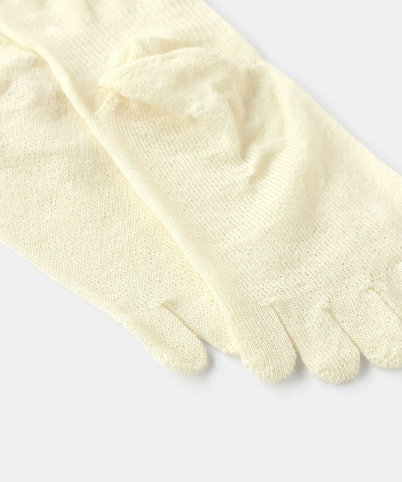 肌に触れる内側はシルク、外側は柔らかく保温性が高いウールを使用した秋冬におすすめの5本指と靴下です。シルクは汗を吸収し、しっとりしたやさしい風合いになり、外側のウールは柔らかく保温してくれます。重ねて履くことで寒い冬もより温かく過ごせます。