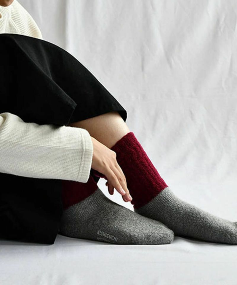 NISHIGUCHI KUTSUSHITAが届ける雪国対応の靴下。 生後1年以内の柔らかなキッドモヘアとウールを混紡した起毛糸を使用しております。 モヘヤの特徴は柔らかで保温性が高く、ウールとブレンドすることで薄手でも温かな靴下に仕上がりました。 足の部分をパイル、足首は二重に編まれたレッグウォーマーになっております。