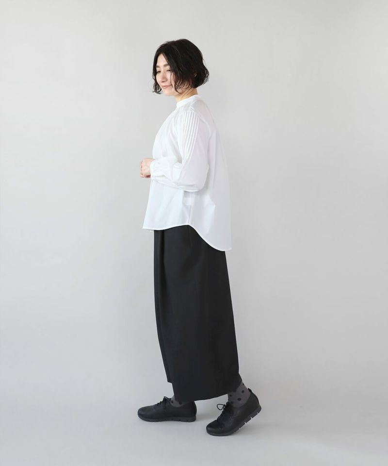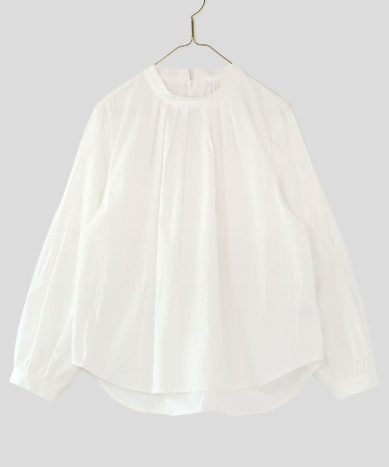 スタンドネックにタックを施したデザインが印象的な1着です。