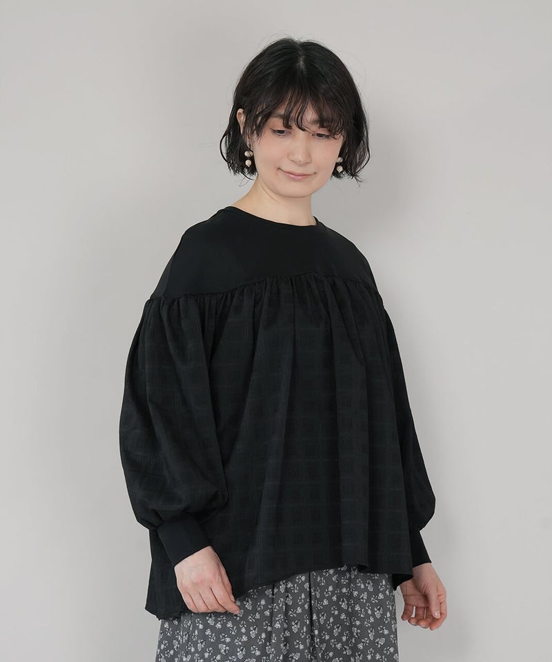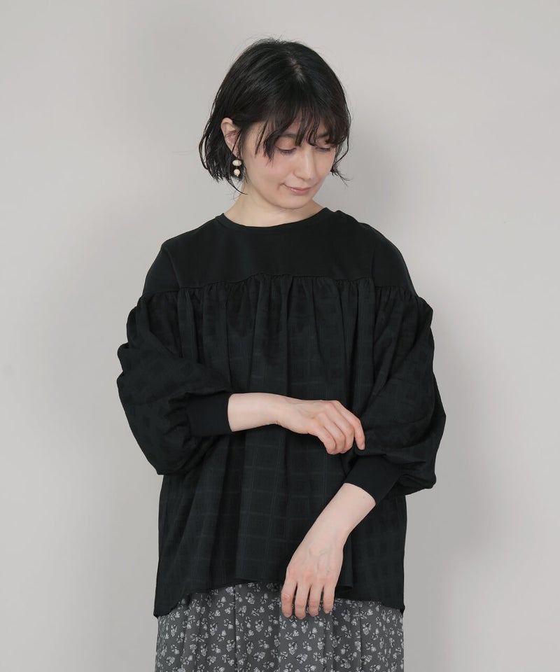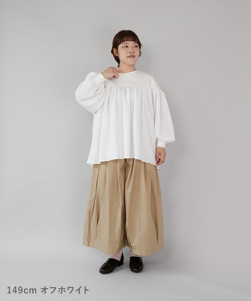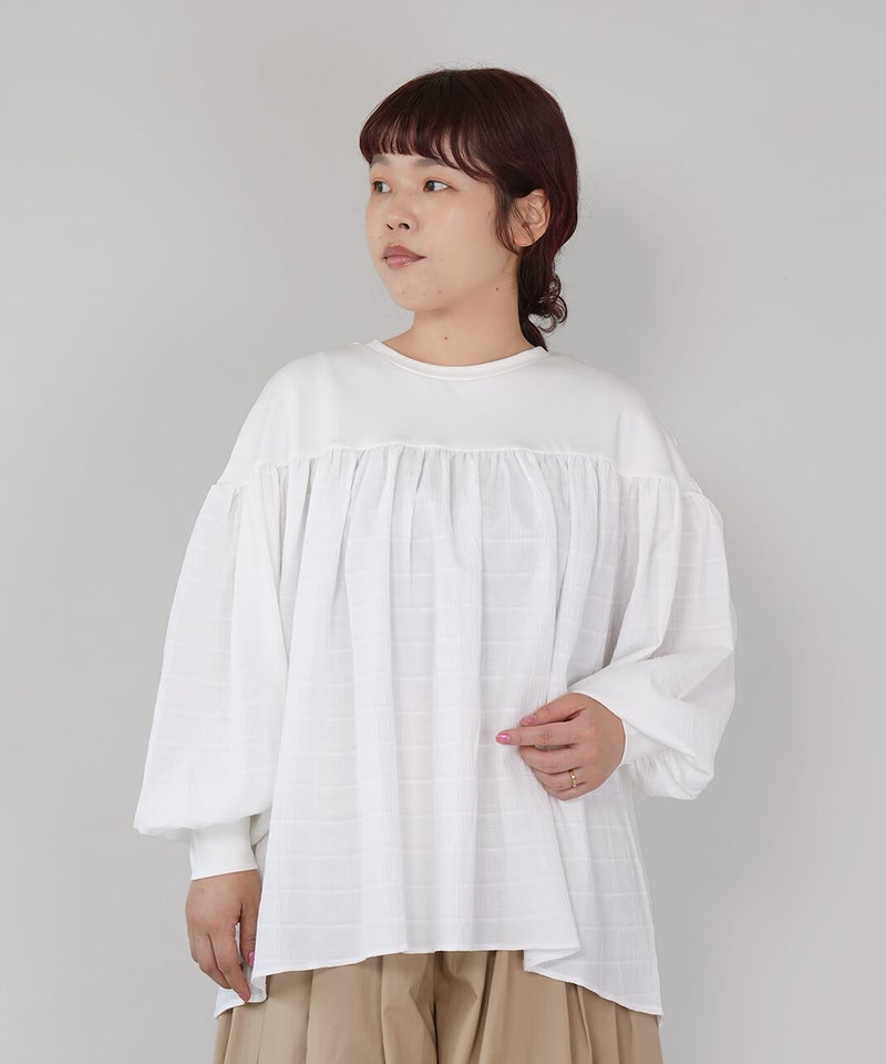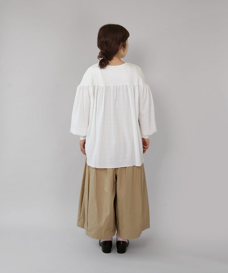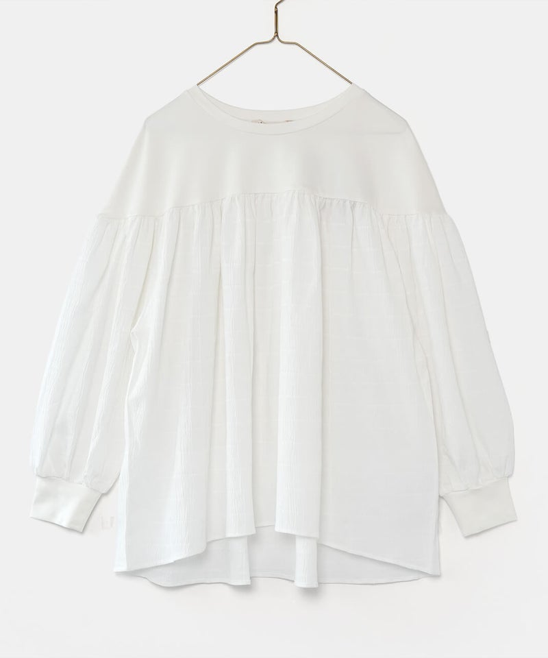 コットンとポリエステルをブレンドした、軽やかなカットソー。ほどよくボリュームのある袖がさりげないアクセントになり、シンプルながらも着映えするデザイン。胸元にたっぷりと施されたギャザーがふんわりとした立体感を生み、上品な印象の1着です。ゆったりとしたシルエットで身体のラインを拾わず、リラックス感のある着心地も魅力。ほんのり透け感のある素材は涼しげで、これからの季節にもぴったりです。