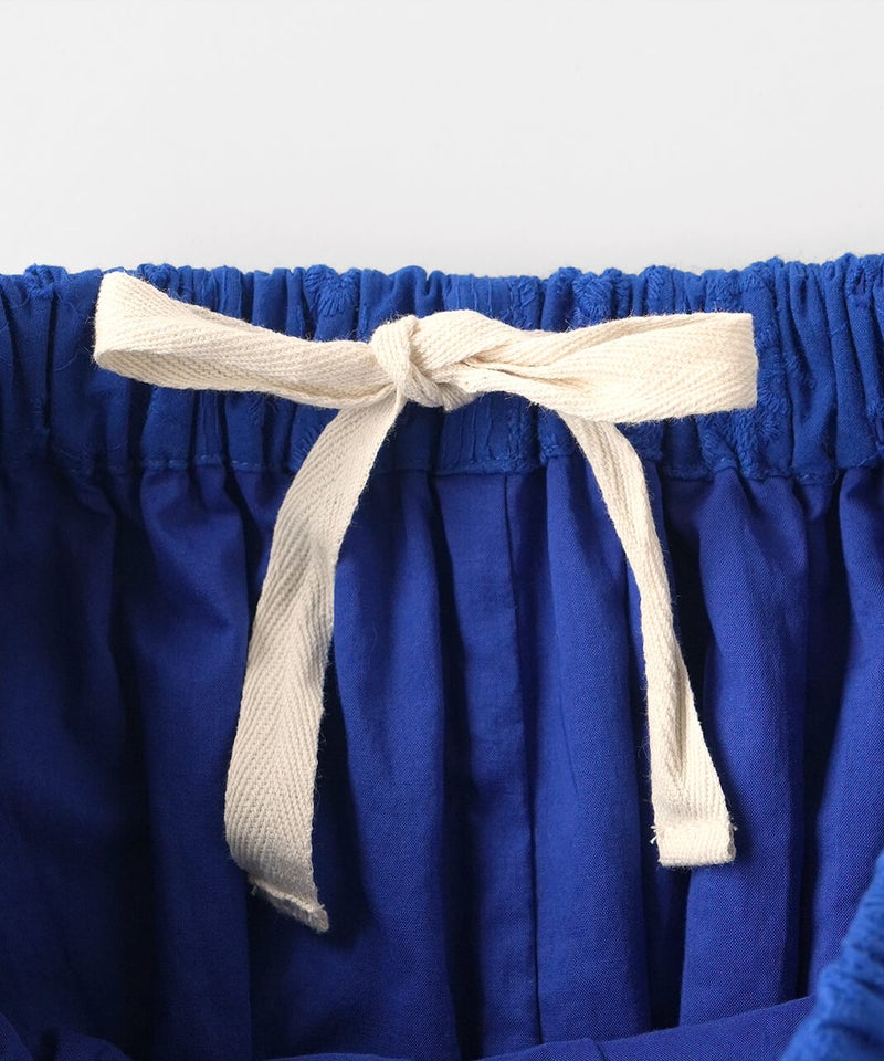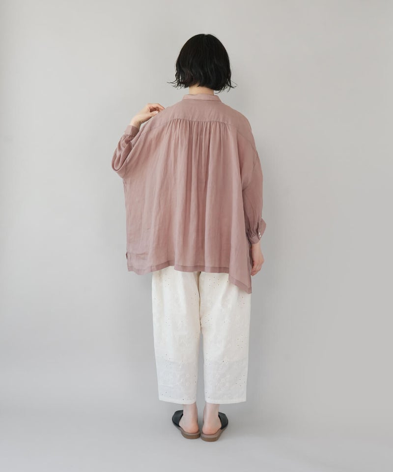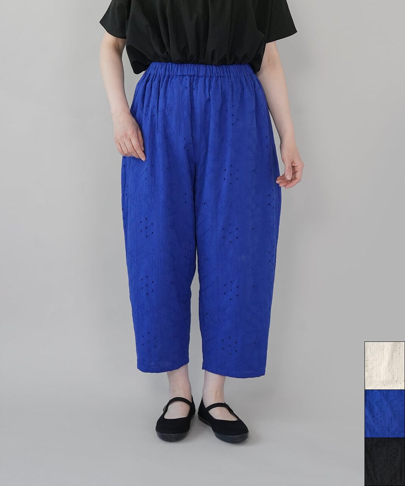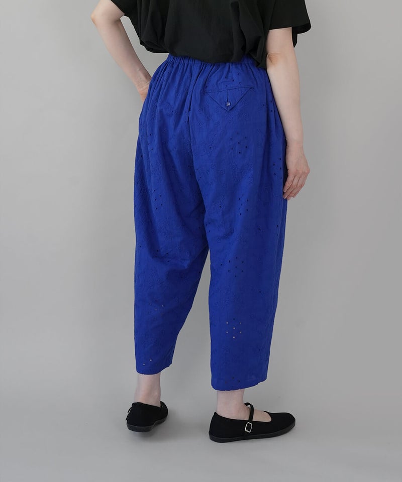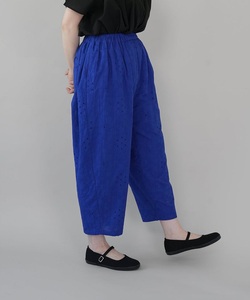 YURK geniet van定番の、ゆるっとパンツ。たっぷりとギャザーを寄せたウエストはゴム仕様で、よく伸びる快適なはき心地が魅力です。すっきりとしたテーパードシルエットで、カジュアルからきちんとしたスタイルまで幅広く対応してくれます。バックスタイルの三角フラップポケットもポイントです。内紐付きでサイズ調整が可能。両サイドには便利なポケットを備え、日常使いしやすいデザインに仕上がっています。