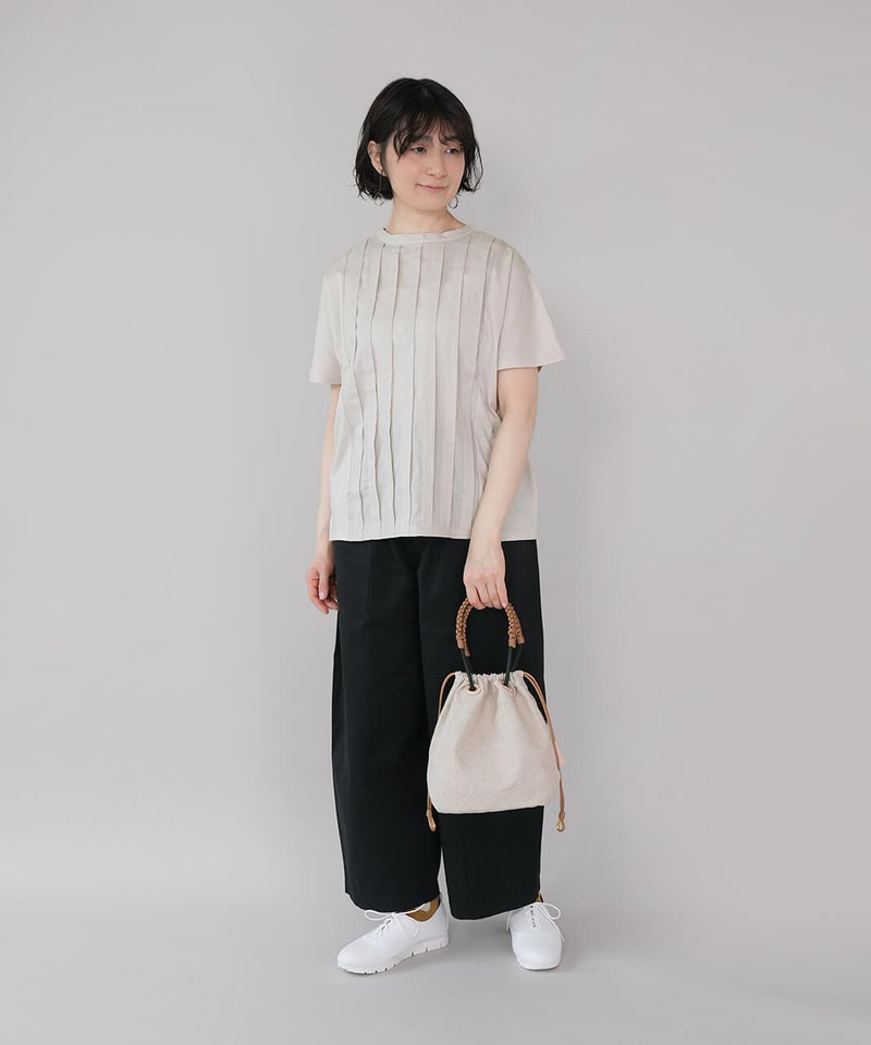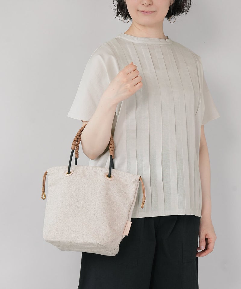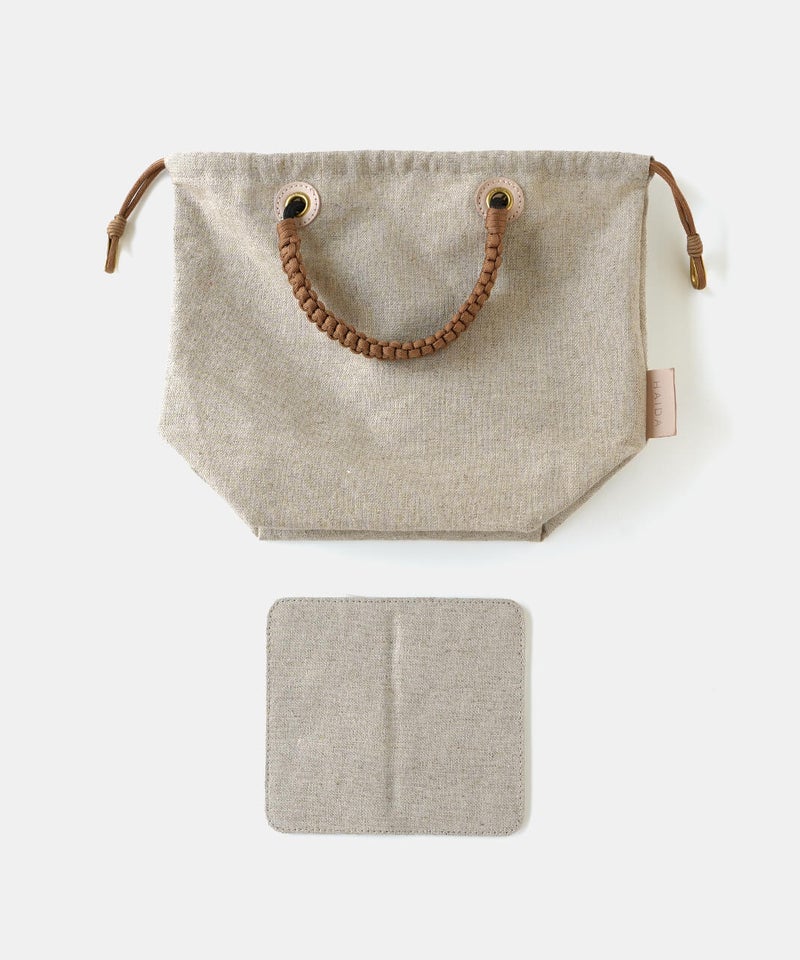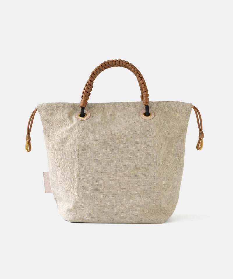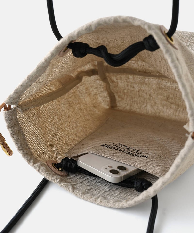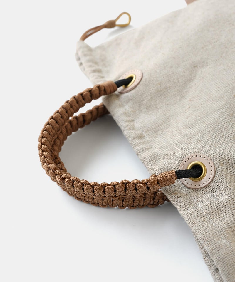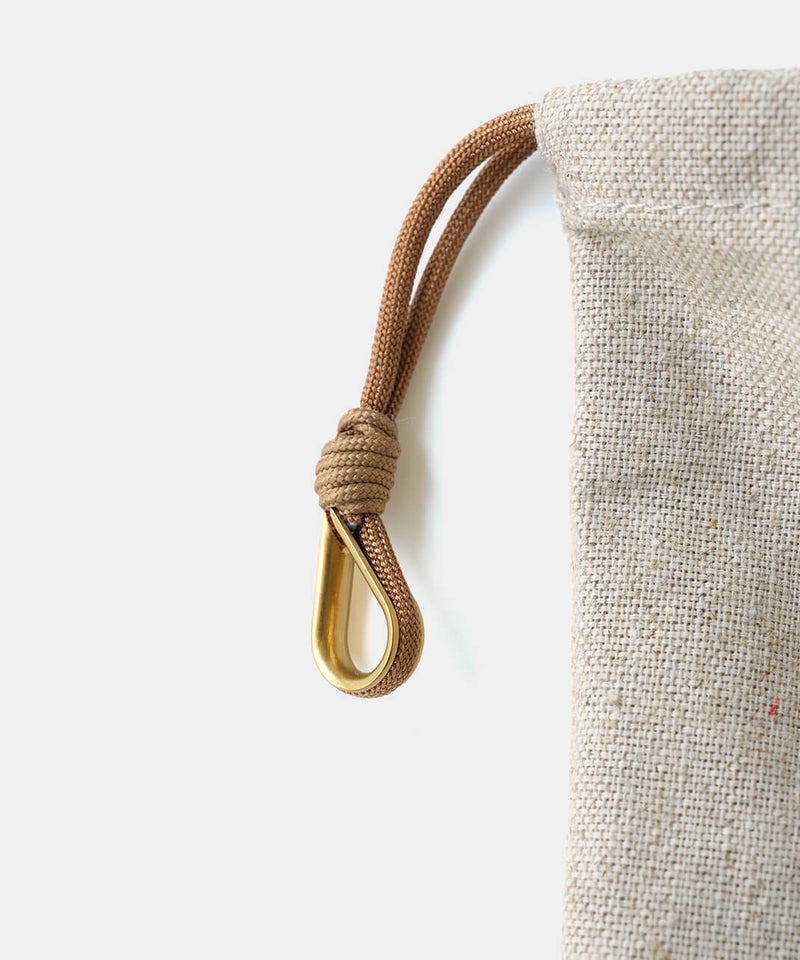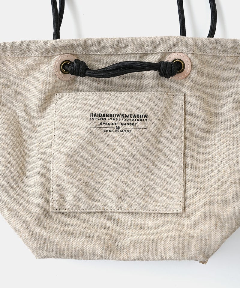 MASSETTはネイティブカナディアンが日常で使うカゴをモチーフにして作られたトートバッグです。ナチュラルで涼し気なリネン素材のボディは変わらず、26SSのMASETTのコンセプトはGOLDとレザーのコンビネーションで上品な印象に。巾着部に使用している"シンブル"は船舶のロープの補強に使うパーツを取り入れ、鍵などを付けるキーホルダーとしてもお使いいただけます。内側のポケットには素材毎にデザインの異なるオリジナルロゴを配置し、より世界観を伝えています。また今回初となるネームとハトメの台座をレザー素材にすることで経年変化を楽しめるデザインとなっています。
