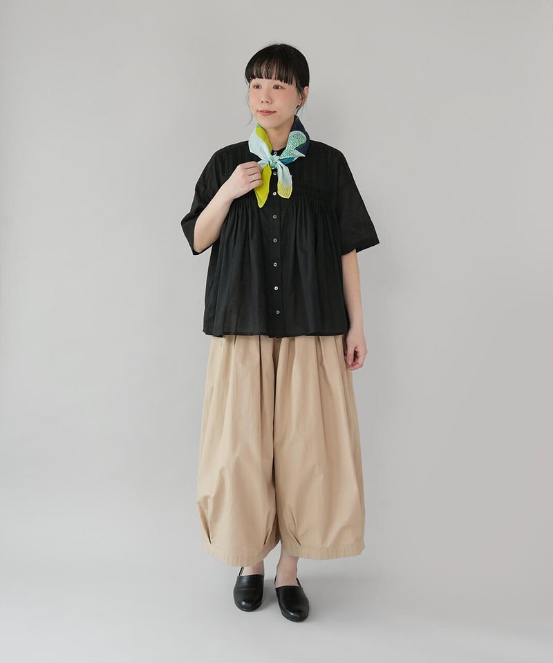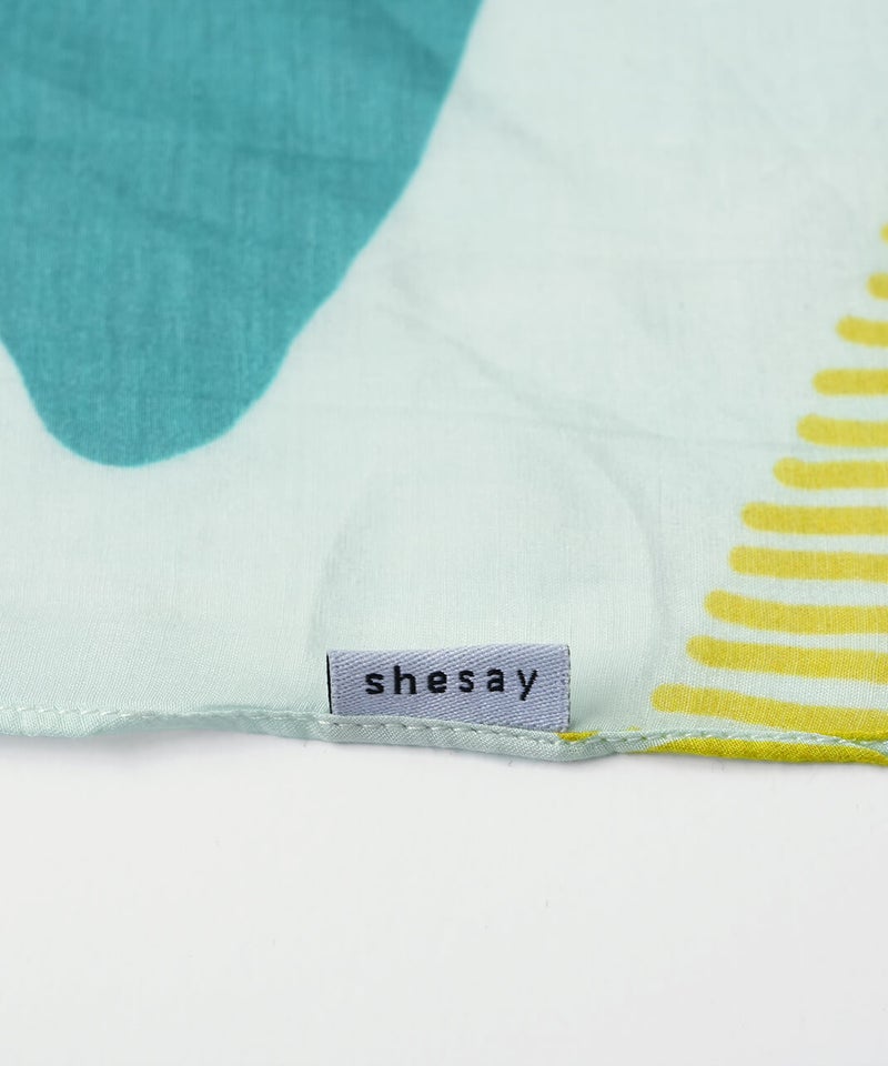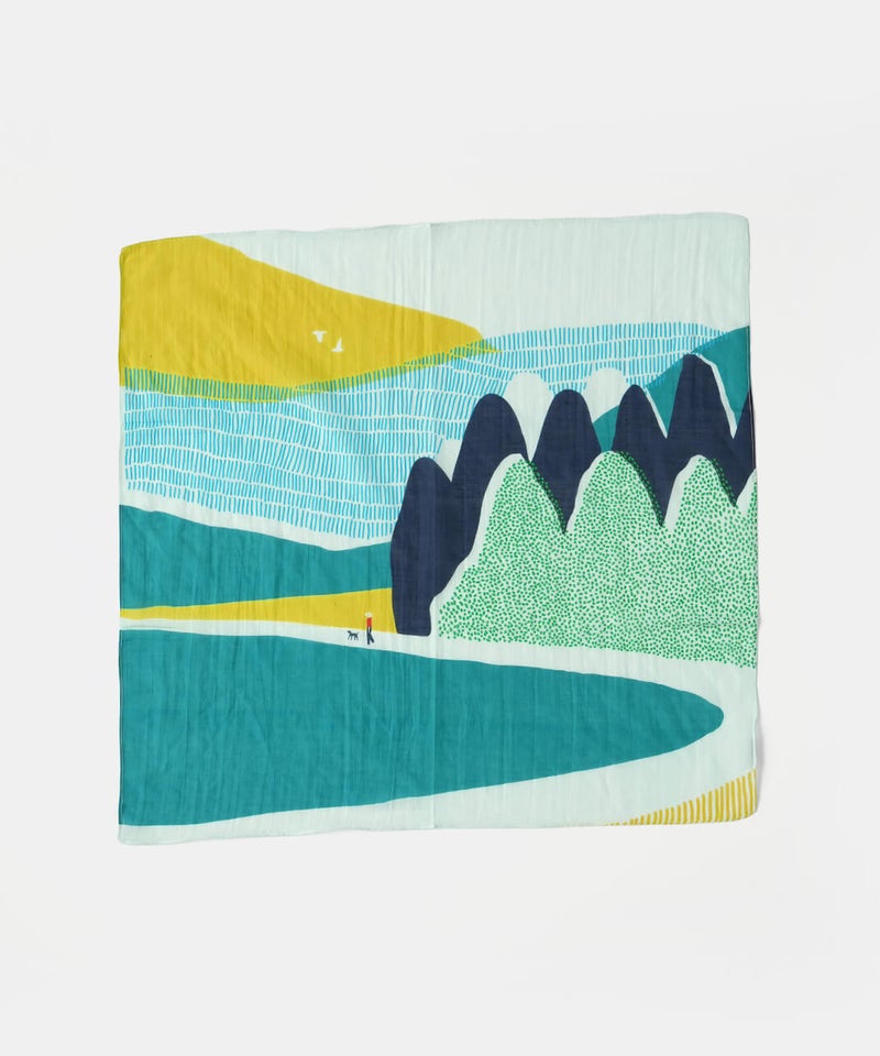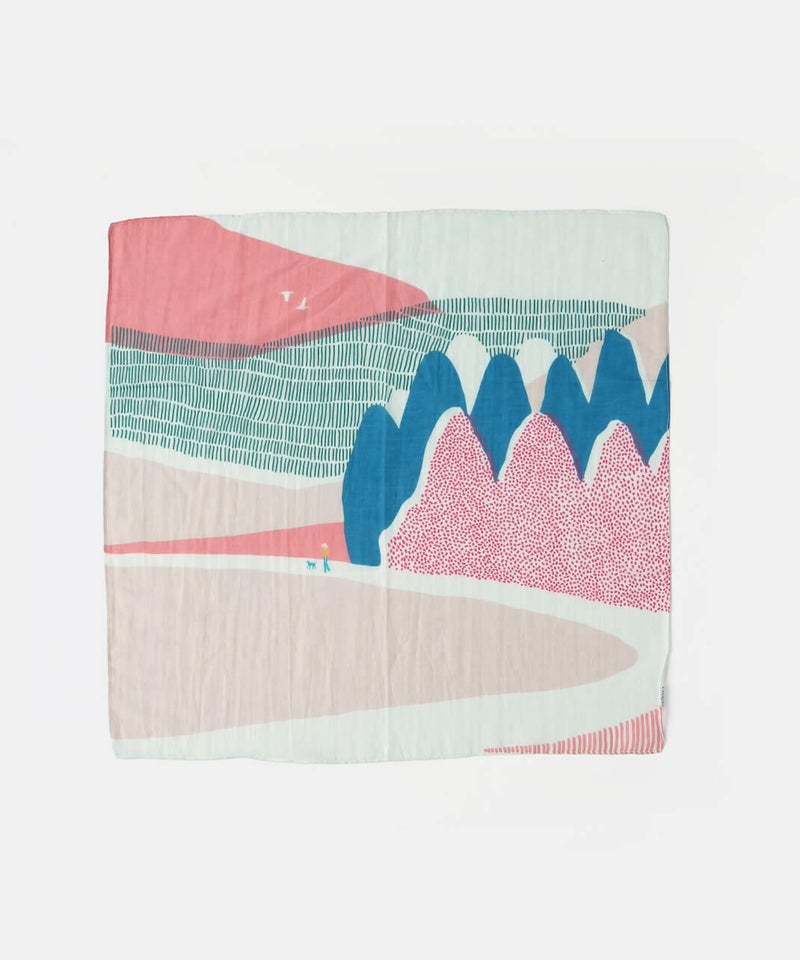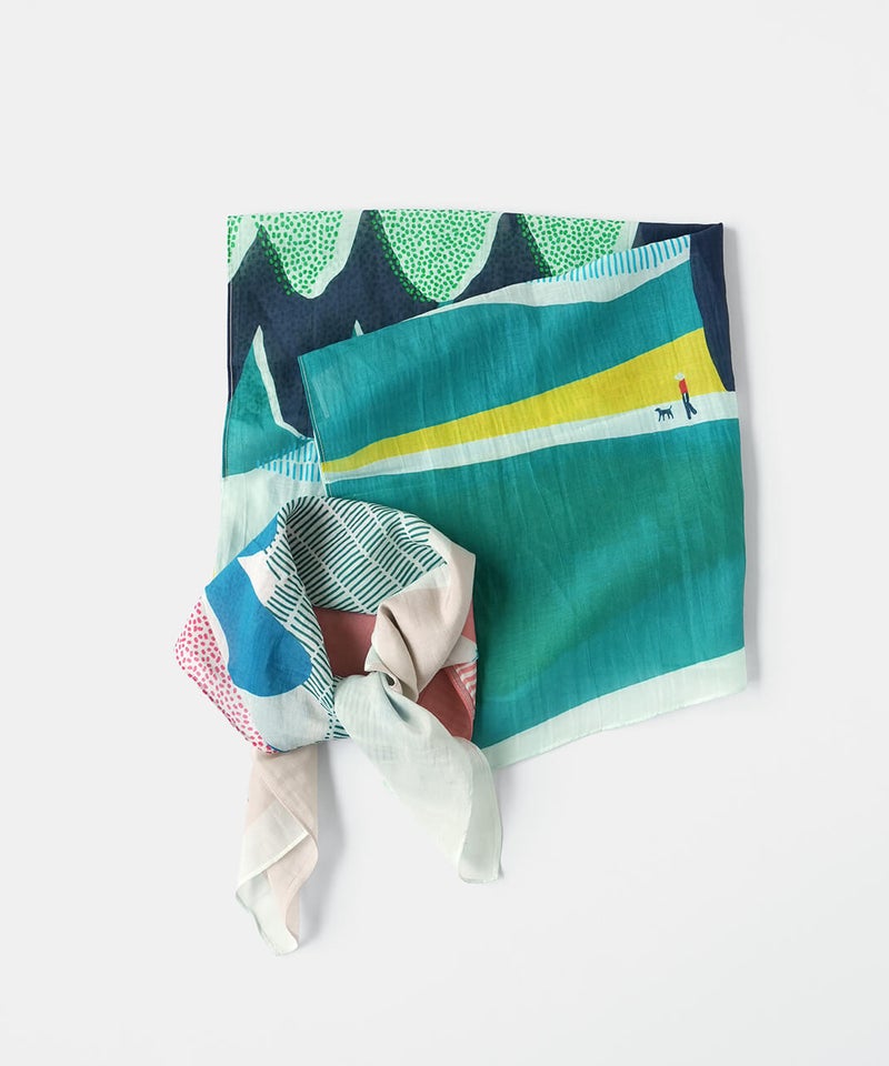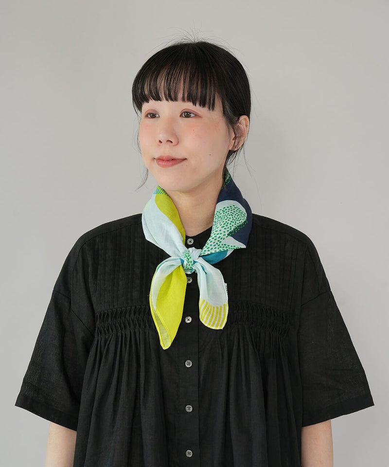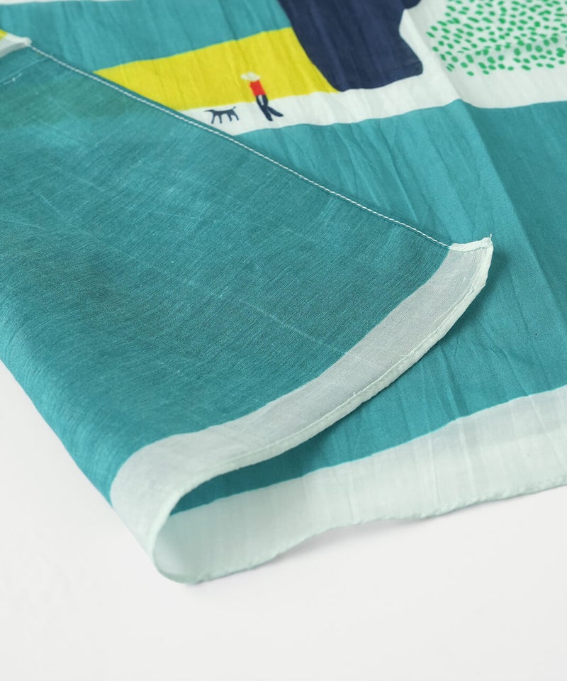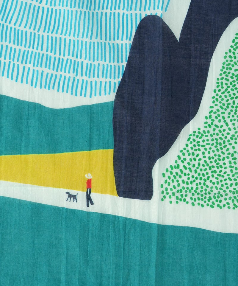 瀬戸内海に浮かぶ直島を散歩している風景をテーマにしたデザインのスカーフ。広げると風景画ですが、巻くと幾何学模様のような柄に見えるのがポイントです。インドの伝統的な手法の一つであるシルクスクリーンプリントで仕上げられました。手作業ならではのムラや揺らぎが、独特の風合いを生み出します。さらっとした肌触りで、色んなアレンジが楽しめます。