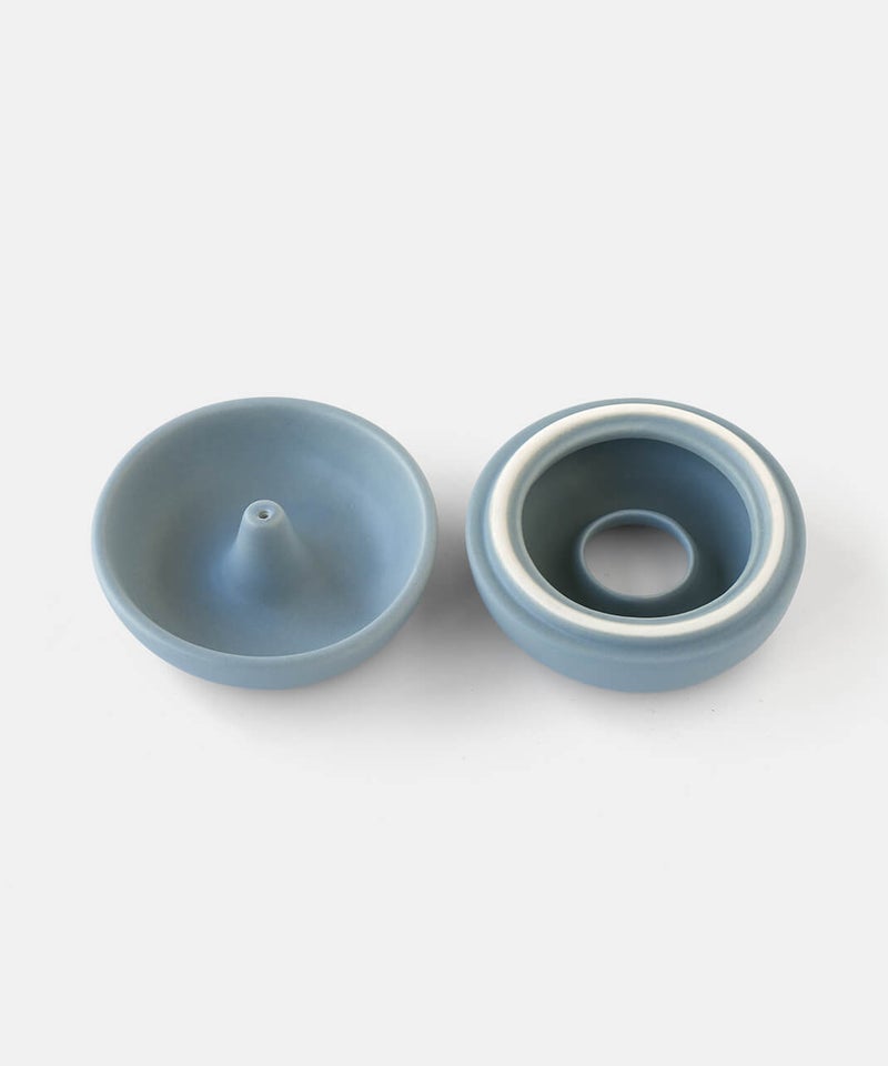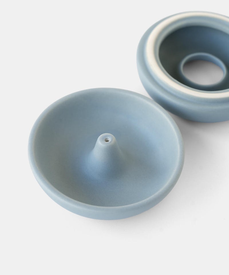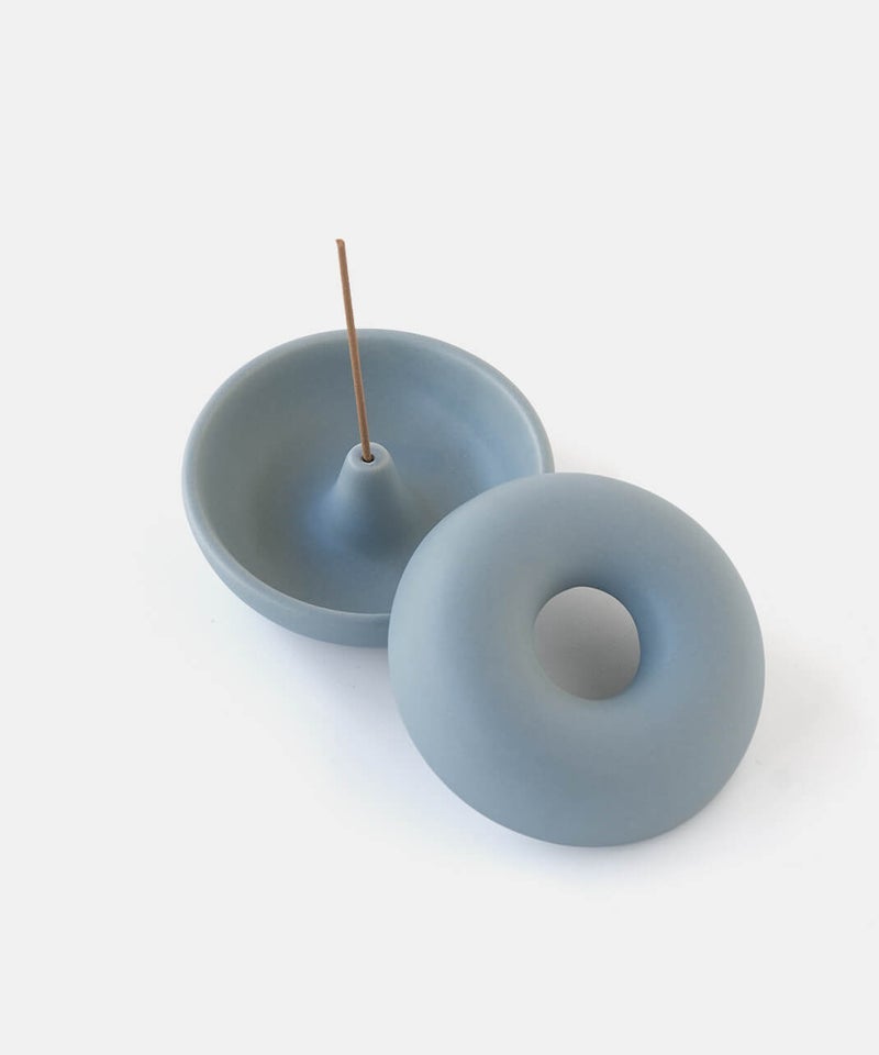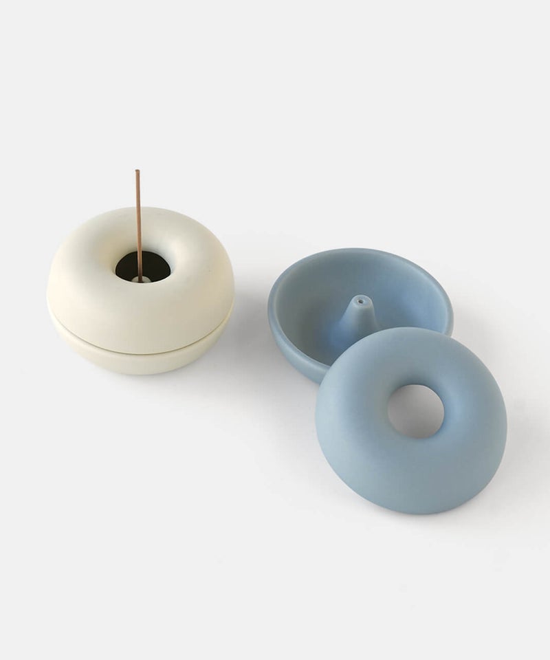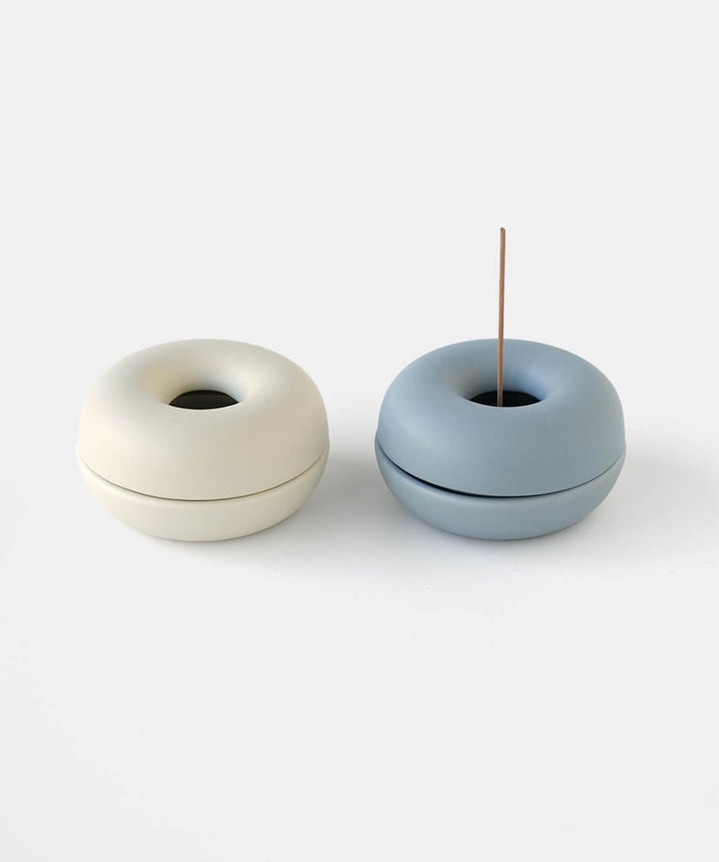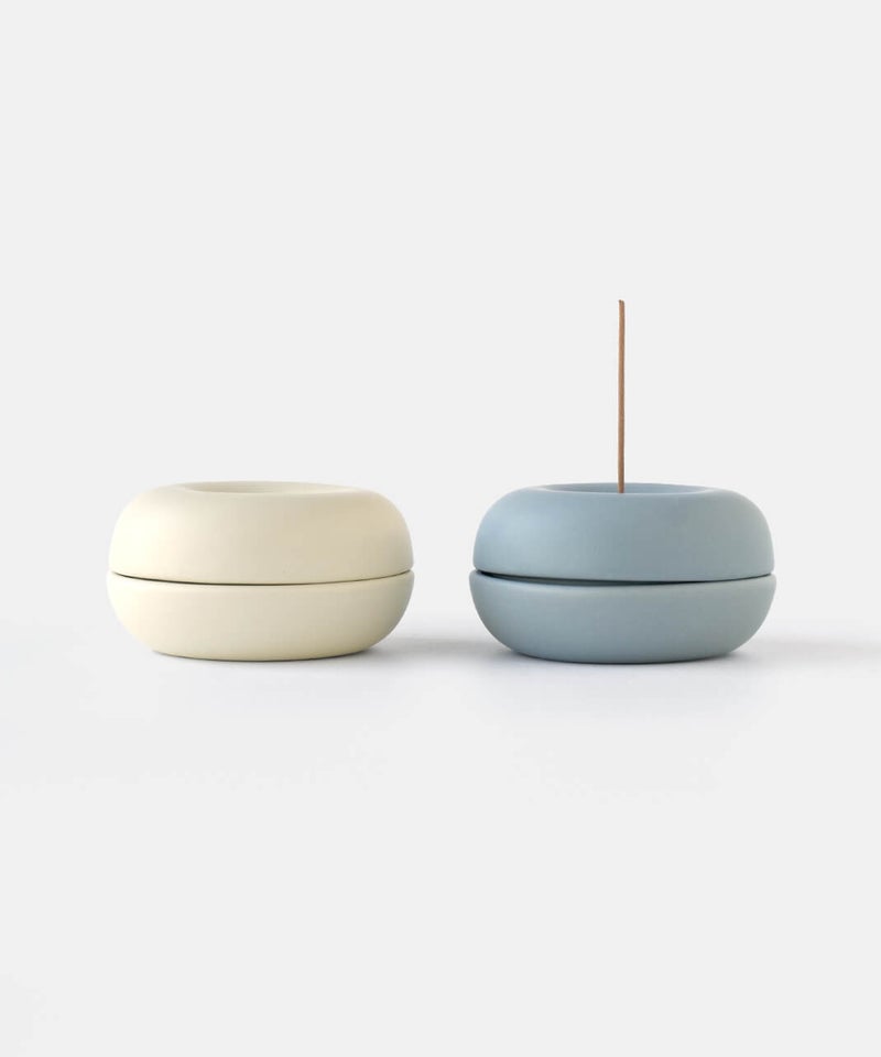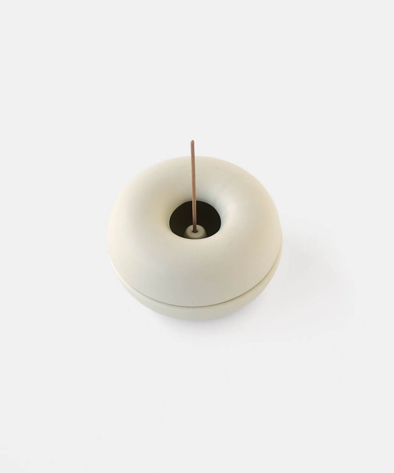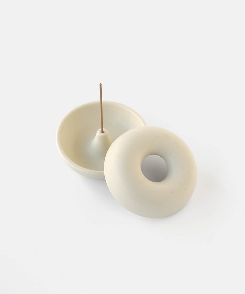 まるでベーグルの様なまるまるとしたフォルムが個性的なお香立て。落ちた灰が内側にたまる構造のため、外から見えにくく、まとめて捨てられるのでお手入れも簡単です。お香のある生活を、より気軽に楽しんでいただけます。蓋を外してすっきりとした見た目でも使えるので、気分で使い分けてお楽しみください。半磁器(ストーンウェア)とは、素焼きのようなマットで素朴なテクスチャが特徴で、陶器の柔らかくあたたかみのある印象はそのままに、磁器よりも耐久性が高く、割れにくい素材です。