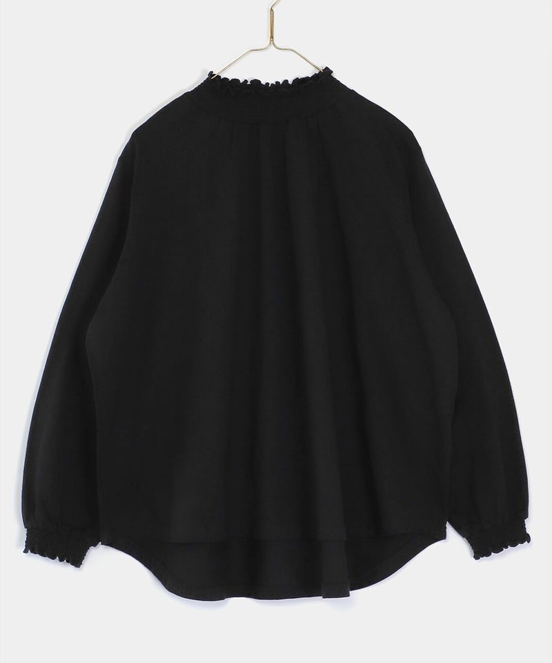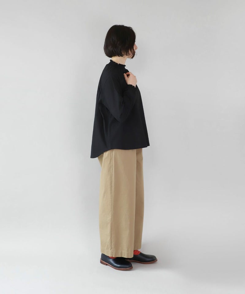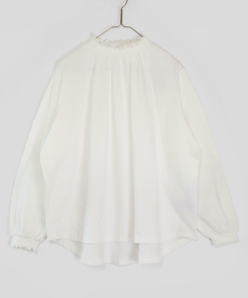 ハイネックと袖口にシャーリングを施した可愛らしいデザインです。