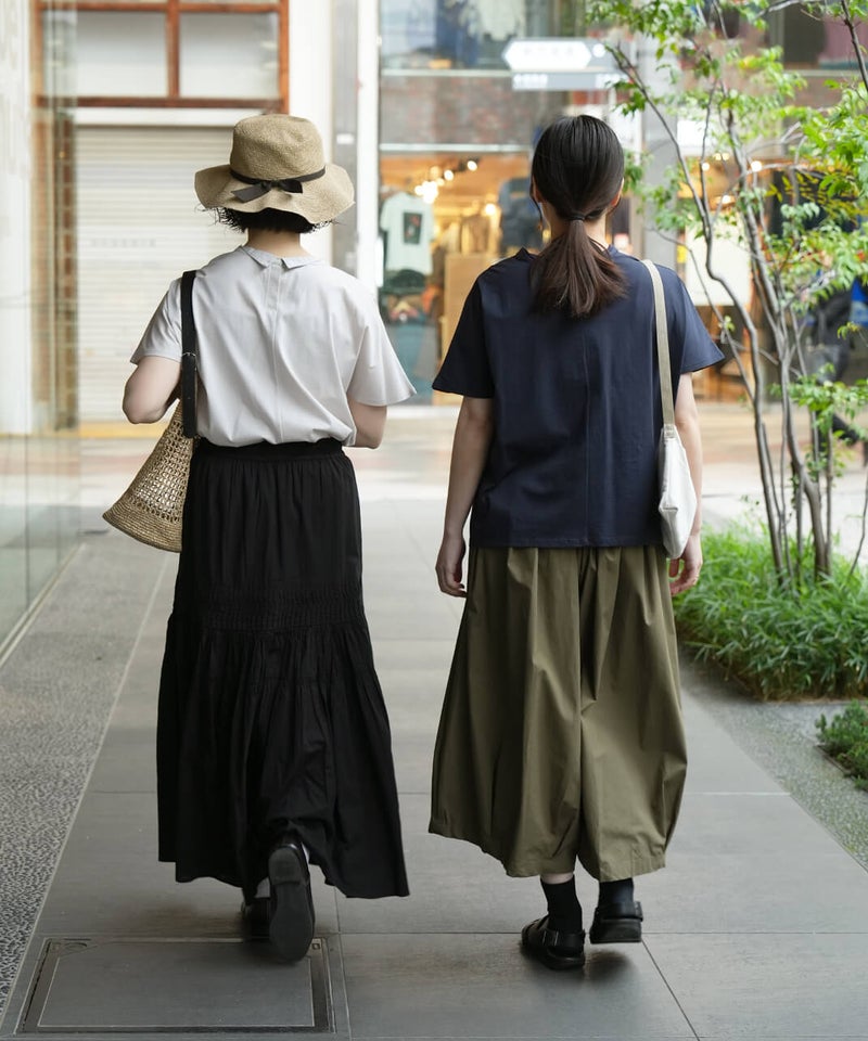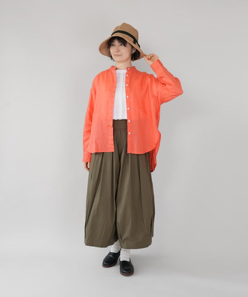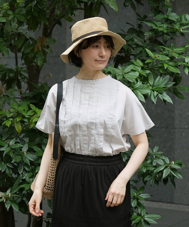正面はコットンリネンの布帛生地を使用したタックデザイン。やや太めのタック幅は、カジュアルにもきれいめにも着こなせます。
