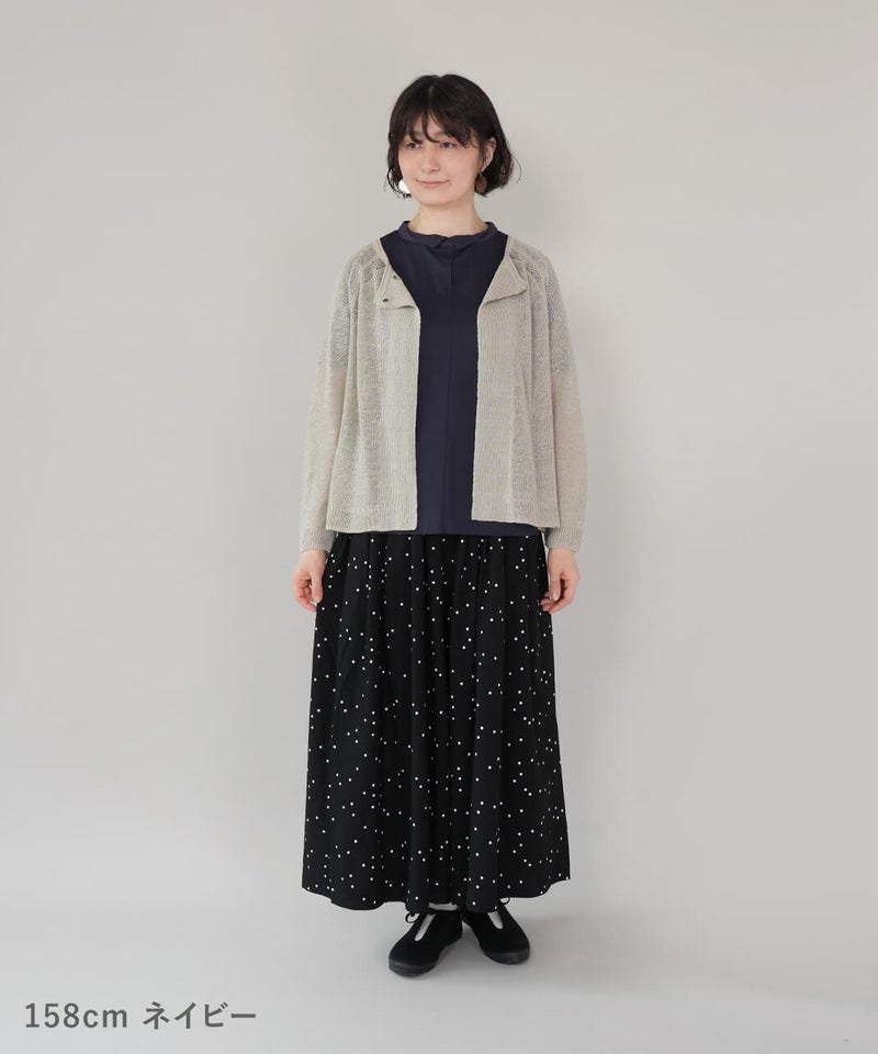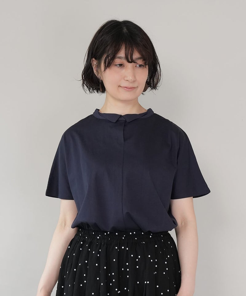ボタン開きの部分はインナーが見えない仕様です。 シルケット加工を施した生地は、やや光沢があり上品な質感。薄手のコットン天竺をベースにしており、気兼ねなく洗濯機洗いが出来ます。