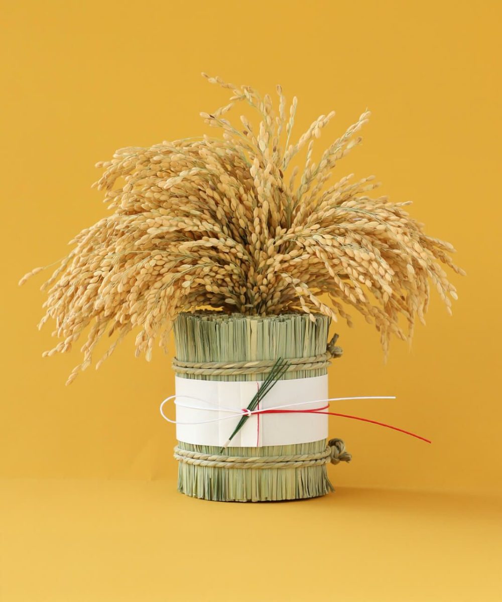 実りへの感謝と、これからの繁栄を願って束ねた稲穂の縁起飾りです。古くから日本人の暮らしを支えてきた稲は、神聖な存在とされてきました。その恵みを束ねたお飾りは、心静かに暮らしの中に福を招く、祈りのかたちです。玄関やリビングに飾るだけで、新しい一年を穏やかに迎えるしつらえが整います。