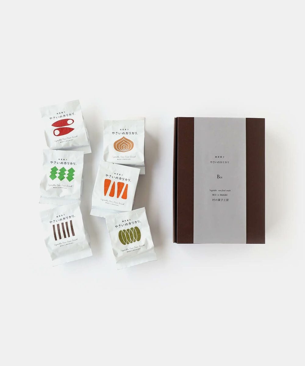 「お母さんが子供に食べさせたいお菓子」をコンセプトに、卵・バター・牛乳などの乳製品・小麦粉・上白糖を使用せず、野菜を30〜40%配合したノンフライ焼き菓子です。スナックのようなカリッとした食感と、野菜本来の味わいが特長。おいも、たまねぎ、にんじん、ほうれん草、ごぼう、かぼちゃの6種を詰め合わせています。