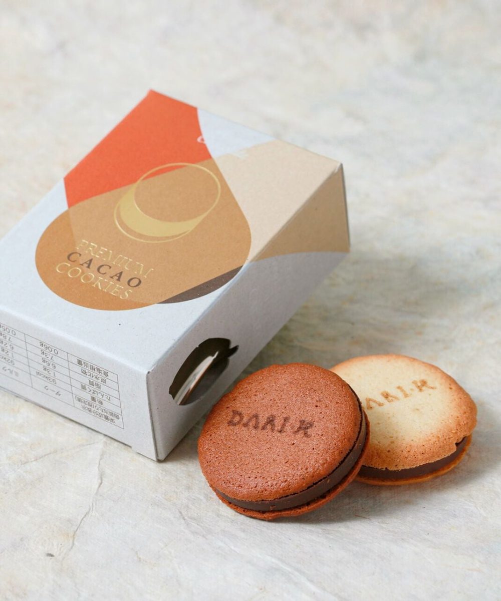 贅沢な厚みのチョコレートをサクサクのラングドシャ生地でサンドした、リッチな味わいのカカオサンドクッキー。バターとアーモンドが香る生地が主役のチョコレートを引き立て、1枚でも満足感のあるボリュームに仕上げました。インドネシア産カカオのフルーティーな酸味を楽しめるダークと、芳醇な風味とミルクのコクが広がるミルクの2種類をご用意しています。