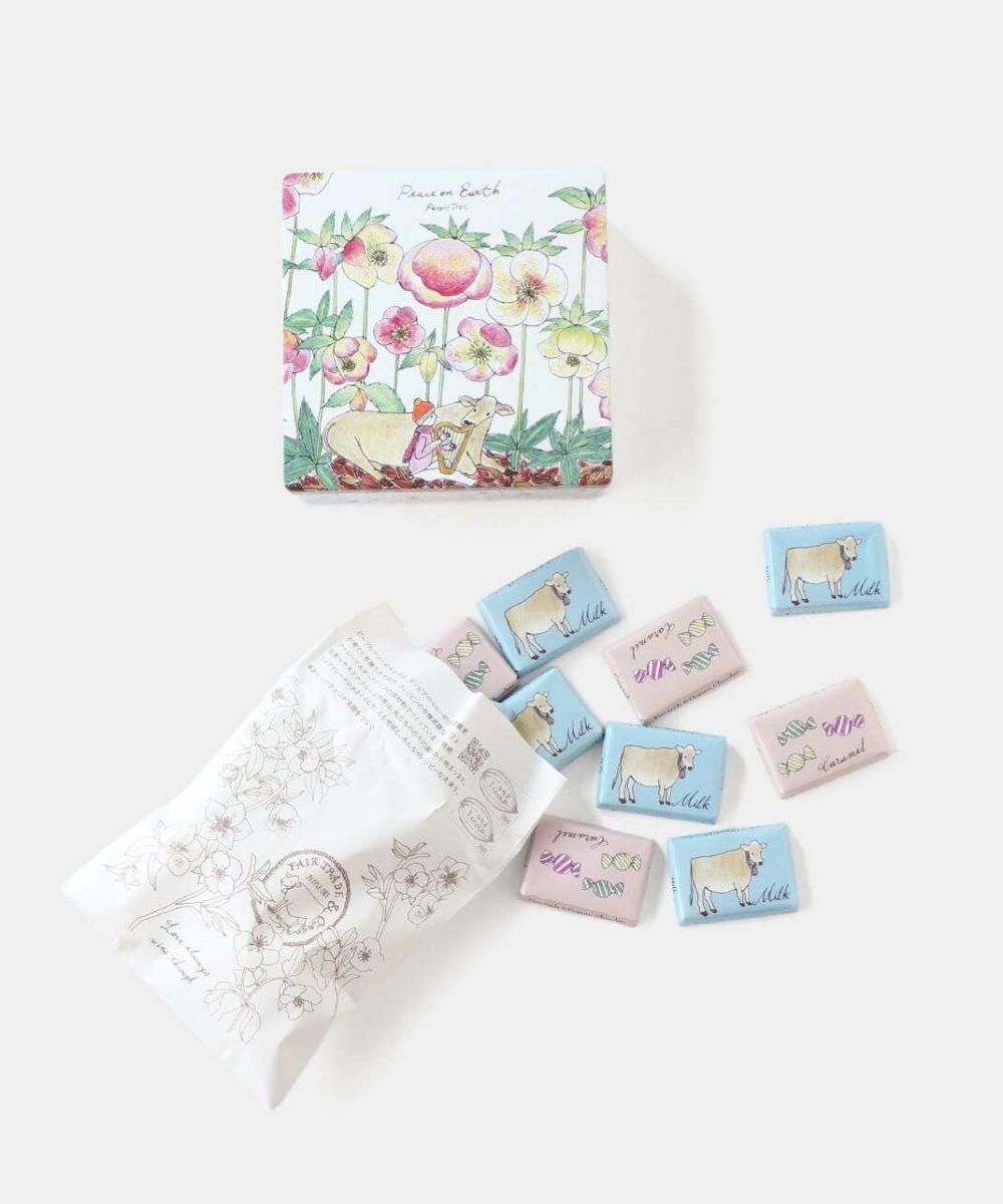 添加物不使用・有機原材料を使用したフェアトレードのオーガニックミルクチョコレート。粗糖と黒糖を使い、ヘーゼルナッツパウダーを練り込んだカカオ分約38%のリッチでなめらかな口どけが特長です。福祉施設「嬉々!! CREATIVE」のアーティストによるポップな限定アートパッケージ仕様で、プチギフトにぴったりです。