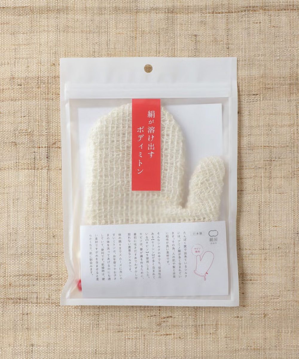 シルクの保湿成分「セリシン」がたっぷりの、特別な糸「キビソ」を使用したボディミトンです。ミトン型なので手にはめて身体の隅々まで洗いやすく、毎日のお風呂の時短も期待できます。つける・塗る保湿が合わない方にも、キビソボディミトンなら肌に優しく、簡単に全身保湿ケア。キビソは少し硬めの糸ですが、摩擦が起こりにくく、人の肌に近い線分なので敏感肌さんにも安心です。