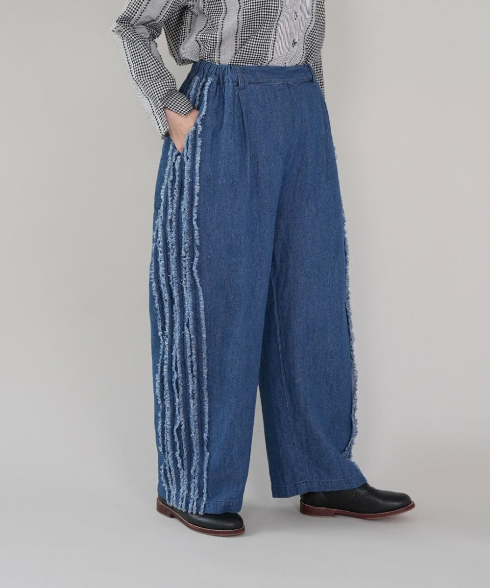 やわらかい6.5オンスのコットンリネンの甘撚りデニム生地を使用したストレートシルエットのパンツです。カットオフした同じ生地を両サイドにテープ状にたたきつけたデザインが目を惹く1着です。