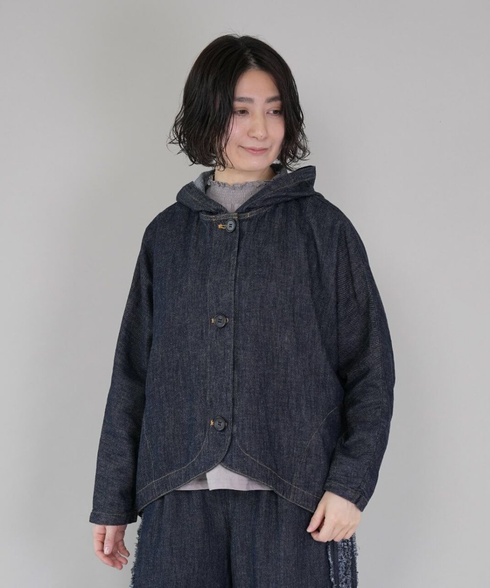 ドルマンスリーブのバルーンジャケットにフードを取り付けたデザイン。背面にはタックを施し、自然な広がりのあるゆったりした着心地に。同素材のパンツやベストとのセットアップもおすすめです。