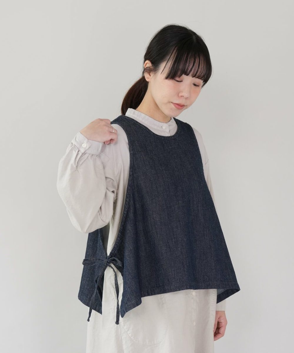 やわらかい6.5オンスのコットン甘撚りデニム生地のベスト。Vネックとクルーネックの前後着用が可能な2WAY仕様です。
