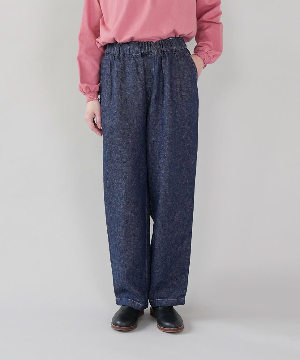 やわらかくしなやかなへビーリネンツイルと、上質なリネン特有の表情のあるインディゴリネンデニムを使用したパンツです。ウエストはゴム仕様と締め付け感の少ない快適な穿き心地です。 内紐付きのためサイズ調整が可能。