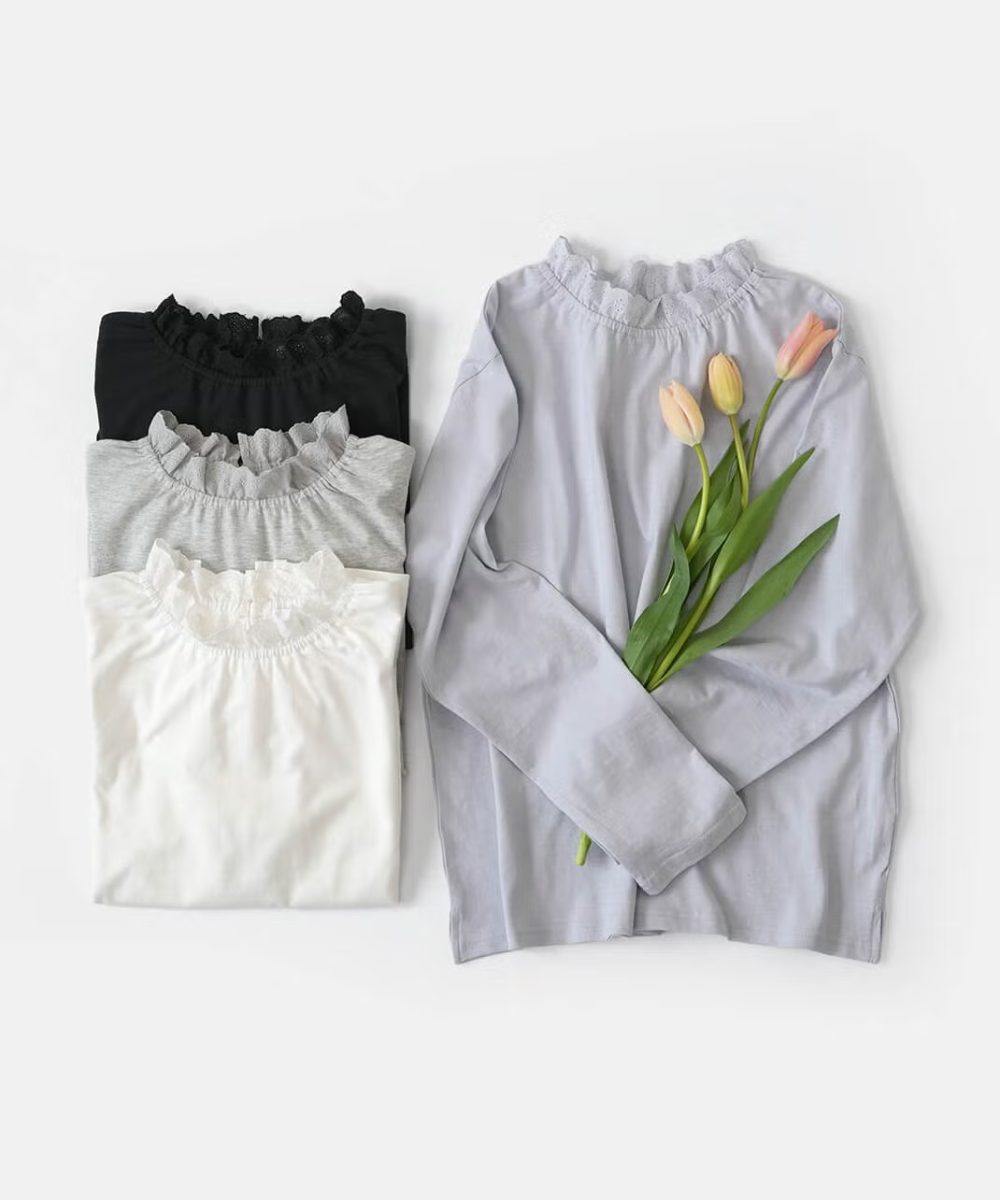 肌触りの良いコットン素材を使用したカットソーです。首元にあしらわれた繊細なコットンレースが程よい甘さのナチュラル感を演出してくれます。背側の襟元は涙開きにし、ボタンで着脱のしやすいデザインに。シンプルなデザインながらも、首元のディテールがアクセントになる1着です。