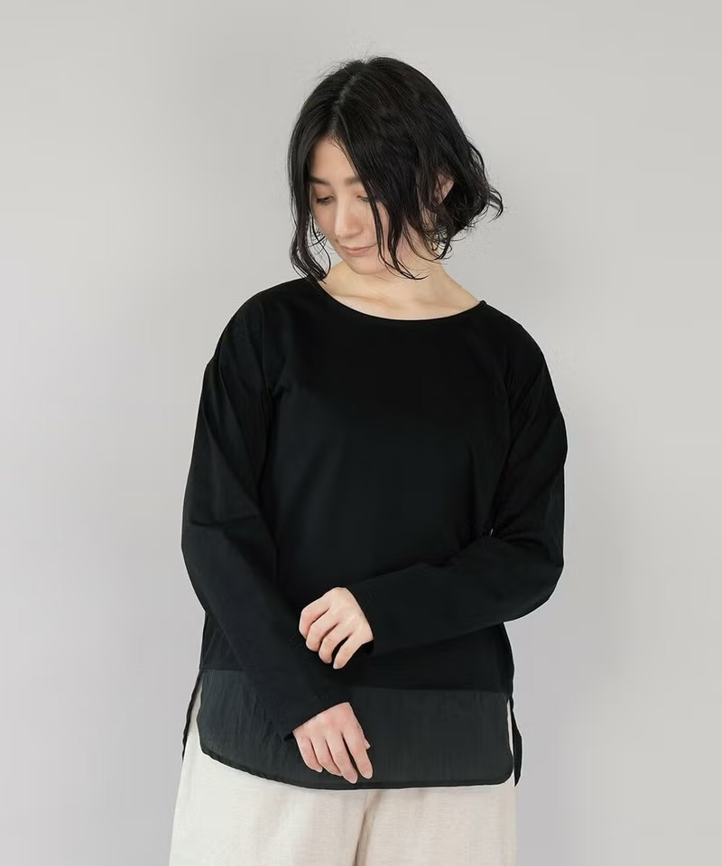 ほのかに光沢感のあるさらりとした天竺とシワ加工のポリエステル素材を組み合わせたカットソーです。ストレッチの効いたさらりとした肌触りと広めのボートネックにゆとりのあるシルエットでリラックスした着心地。裾から異素材に切り替え、重ね着風のデザインに仕立てました。