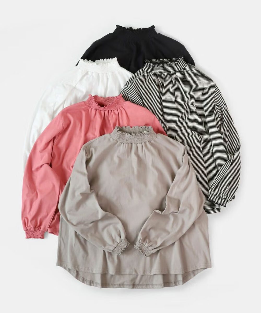 柔らかいコットン100%の生地が着心地の良い1着です。フリルのシャーリング襟と袖口がポイントです。重ね着ではもちろん、1枚でも映えて、着回し自在のアイテムです。