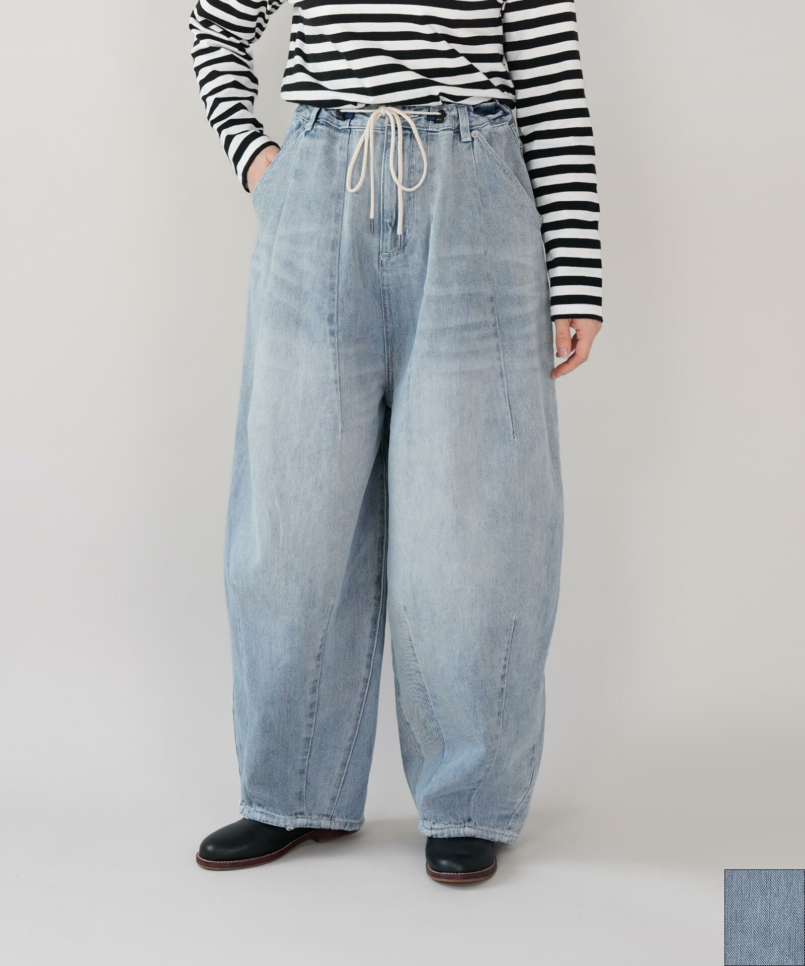ウエストの紐が少し頼りない気がします。腰回りはかなりゆったりです。バルーンの形やダメージの感じが良いです。 -